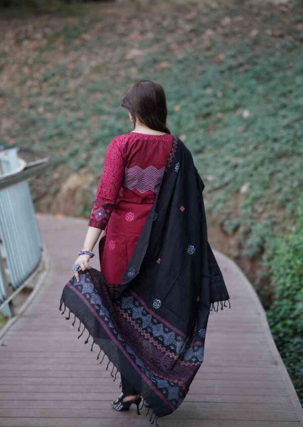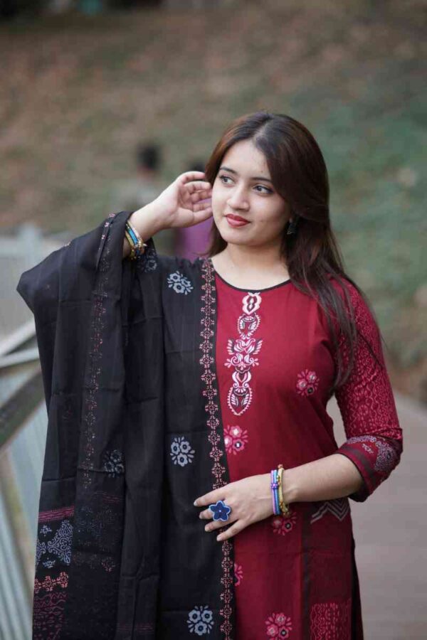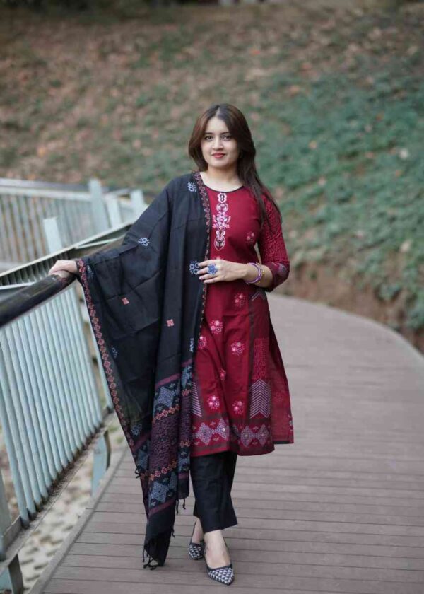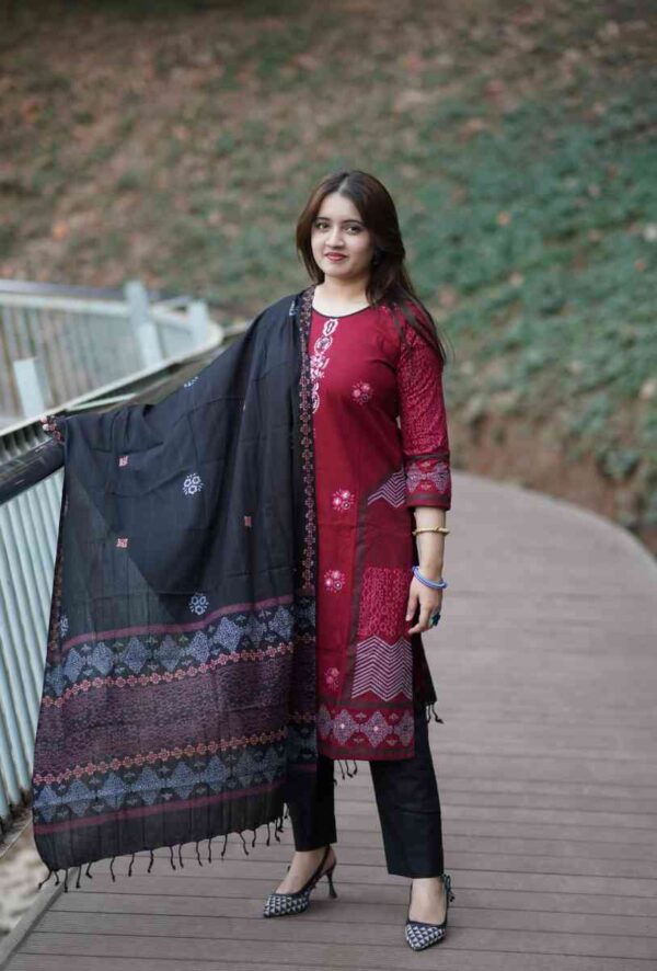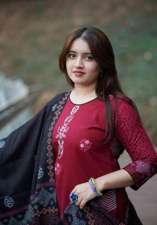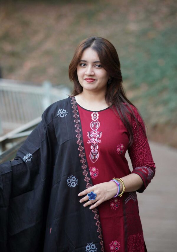 কাজঃ স্থায়ী ব্লক প্রিন্ট ও এমব্রইয়ডারির অসাধারণ কাজ করা হয়েছে।