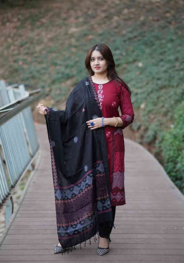 উন্নত মানের কটন ও নান্দনিক স্থায়ী ব্লক প্রিন্ট করা হয়েছে এবং দৈর্ঘ্য ৯০ ইঞ্চি – প্রস্থ ৩৬ ইঞ্চি