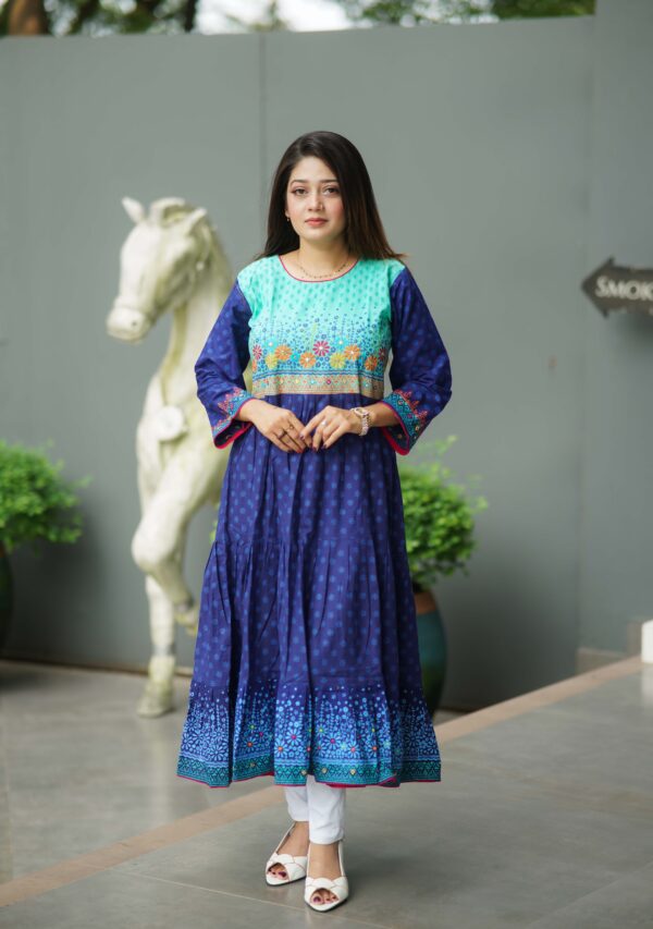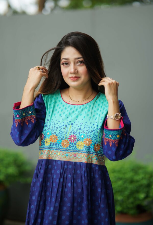 কাজঃ স্থায়ী ব্লক প্রিন্ট ও এমব্রইয়ডারির অসাধারণ কাজ করা হয়েছে।